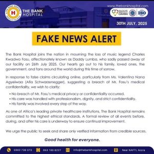 “The Bank Hospital joins the nation in mourning the loss of music legend Charles Kwadwo Fosu, affectionately known as Daddy Lumba, who sadly passed away at our facility on 26th July 2025,” the statement read. “Our hearts go out to his family, loved ones, the government, and fans around the world during this time of sorrow.”