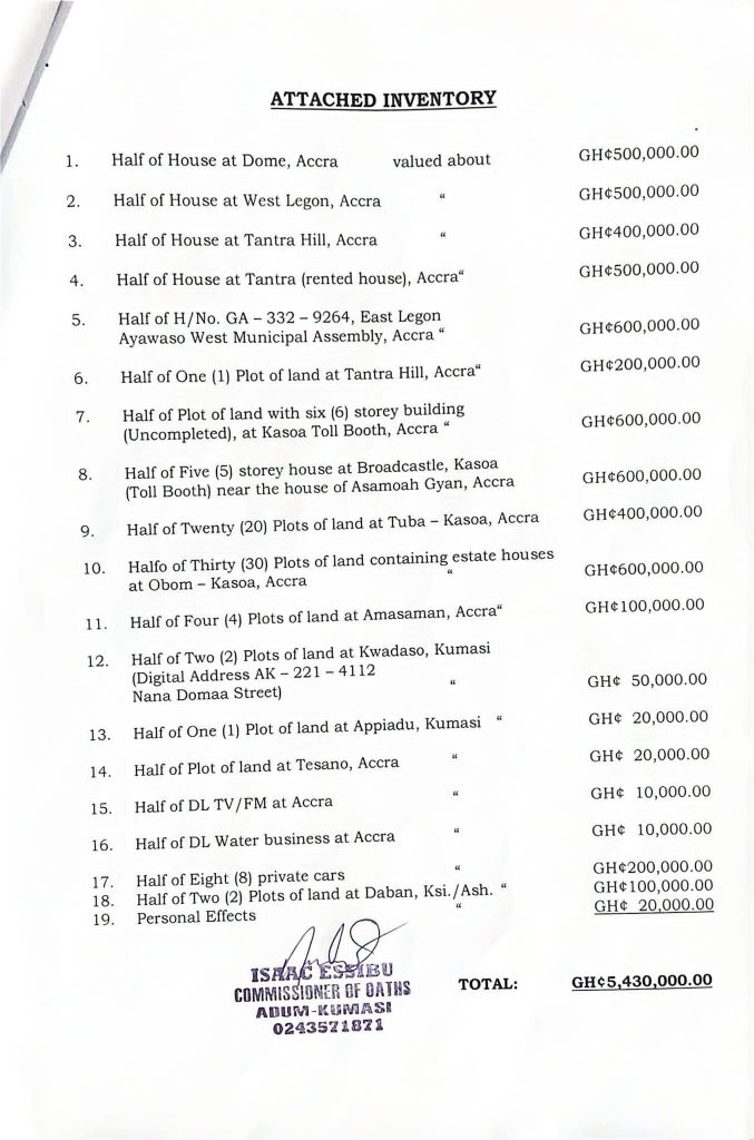 The inventory lists, among others, half interests in houses at Dome, West Legon, Tantra Hill, East Legon, and Broadcast (Kasoa); portions of land at Tantra Hill, Tuba–Kasoa, Obom–Kasoa, Amasaman, Tesano, Kwadaso, Appiadu, and Daban; as well as interests in an uncompleted six-storey building at Kasoa Toll Booth and a five-storey house at Broadcast, Kasoa. Also included are half shares in eight private vehicles, a media outlet (DL TV/FM), a water business, and other personal effects.