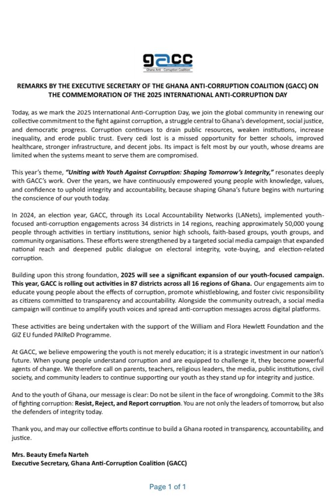 The Ghana Anti-Corruption Coalition (GACC) has renewed its call for young people to lead the fight against corruption as Ghana joins the rest of the world to commemorate the 2025 International Anti-Corruption Day.