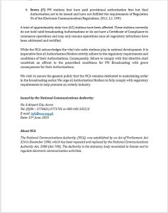 The National Communications Authority (NCA) has ordered the immediate suspension of operations by more than 60 FM broadcasting stations across the country, including prominent outlets such as Asaase Radio and Wontumi FM, over multiple regulatory breaches.