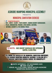 The Asokore Mampong Municipal Assembly (AMMA) has announced a municipality-wide sanitation exercise scheduled for Saturday, November 1, 2025, as part of efforts to promote environmental cleanliness and public health across all communities within the municipality.