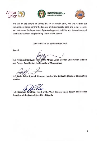 The three mission heads—H.E. Filipe Jacinto Nyusi, former President of Mozambique (AUEOM); H.E. Issifu Baba Braimah Kamara (ECOWAS EOM); and H.E. Goodluck Jonathan, former President of Nigeria and Head of the West African Elders Forum—called on citizens of Guinea-Bissau to remain calm and avoid actions that could escalate tensions.