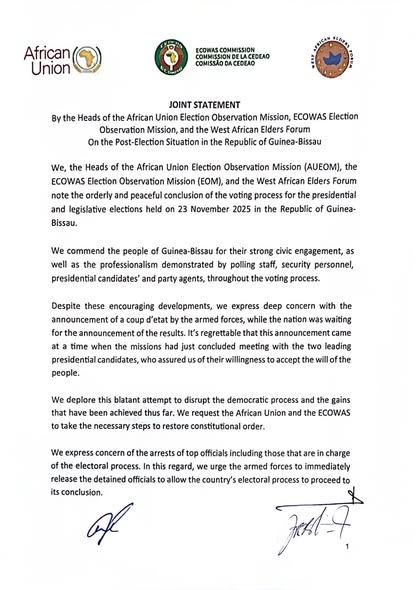 The Heads of the African Union Election Observation Mission (AUEOM), the ECOWAS Election Observation Mission (EOM), and the West African Elders Forum have jointly condemned the military takeover in Guinea-Bissau, calling it a “blatant attempt to disrupt the democratic process” following the country’s November 23 presidential and legislative elections.