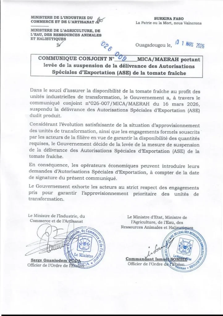 The government of Burkina Faso has lifted the suspension on the issuance of Special Export Authorisations (ASE) for fresh tomatoes.