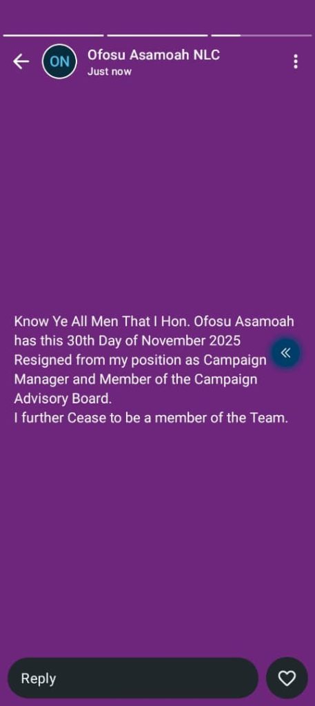 “Know ye all men that I, Hon. Ofosu Asamoah, have this 30th day of November 2025 resigned from my position as Campaign Manager and Member of the Campaign Advisory Board. I further cease to be a member of the team,” his message read.