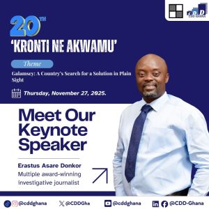 The Ghana Center for Democratic Development (CDD-Ghana) has announced award-winning investigative journalist Erastus Asare Donkor as the keynote speaker for the 20th edition of its annual ‘Kronti ne Akwamu’ Lecture.