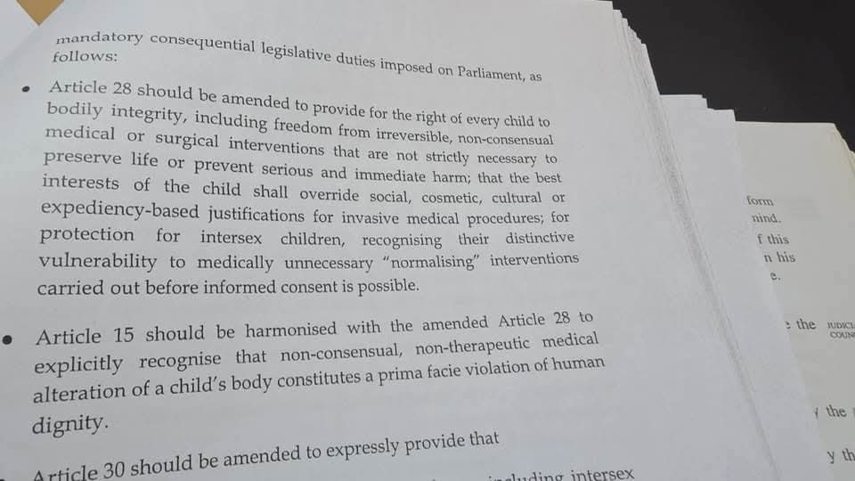 The Committee further recommended that Article 15 of the Constitution, which addresses respect for human dignity, be harmonised with the proposed changes to Article 28. This, it said, would make it clear that non-consensual and non-therapeutic medical alteration of a child’s body amounts to a prima facie violation of human dignity.