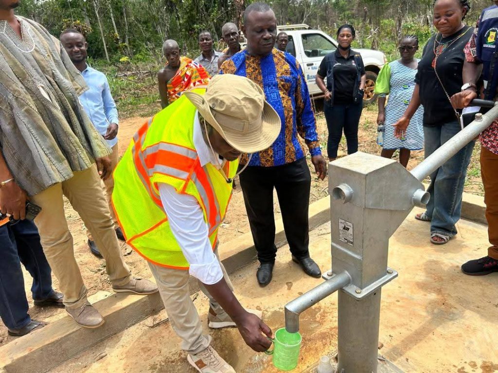 Key projects inspected included the construction of boreholes with hand pumps in several communities, classroom blocks at selected basic schools, a community centre at Mpasaso I, and institutional sanitation facilities in towns such as Wioso, Barniekrom, and Kunsu.