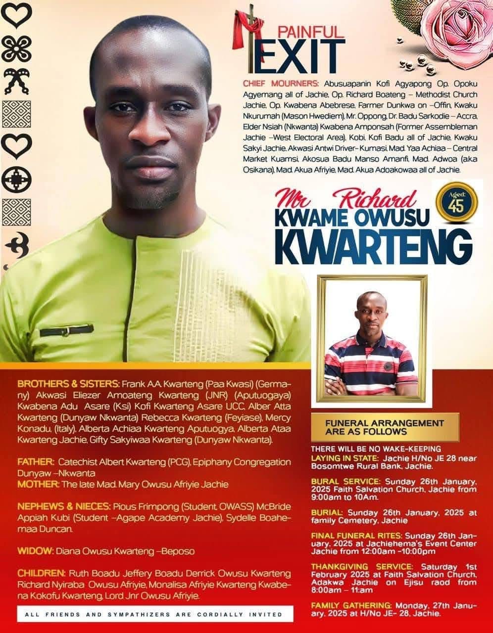 Funeral services for the late youth leader were held on Sunday, January 26, 2025, at Faith Salvation Church in Jachie, where he was laid to rest with final rites conducted on the same day.