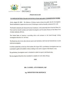 In a statement issued in Accra on Monday, the Ministry said the board is chaired by the National Security Coordinator, with membership drawn from the Ghana Air Force and the Aircraft Accident and Incident Investigation and Prevention Bureau of the Ghana Civil Aviation Authority (GCAA).