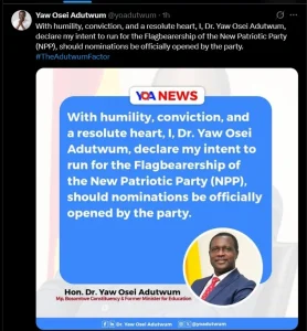 “With humility, conviction, and a resolute heart, I, Dr Yaw Osei Adutwum, declare my intent to run for the Flagbearership of the New Patriotic Party (NPP), should nominations be officially opened by the party,” he wrote.