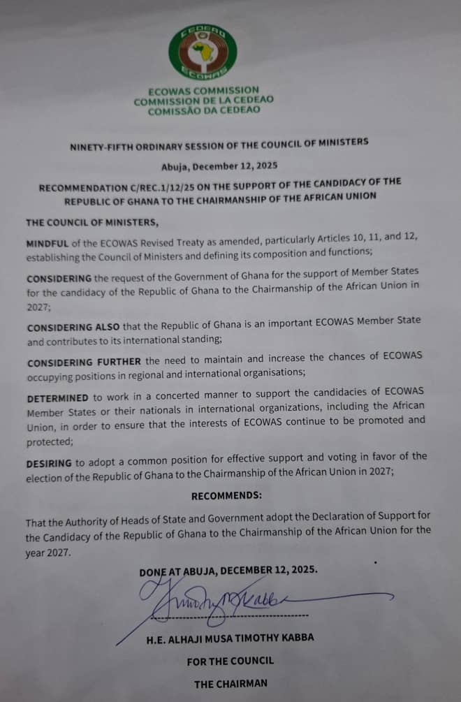 In an official recommendation titled C/REC.1/12/25, the ministers urged all ECOWAS Member States to adopt a common position in support of Ghana’s candidacy.