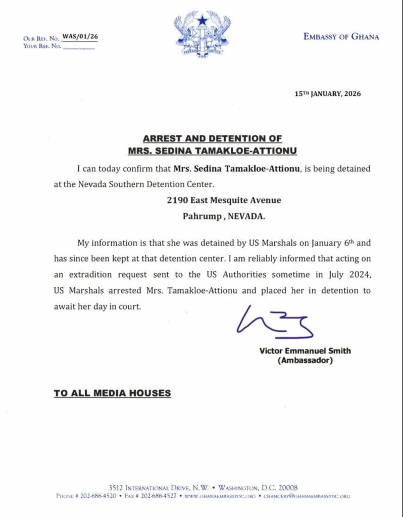 In a press statement released on Thursday , January 15, 2026, and signed by the Ambassador under the headline “Arrest and Detention of Mrs. Sedina Tamakloe-Attionu”, the diplomat disclosed that the former government appointee was taken into custody by U.S. Marshals earlier this month.