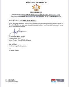 The Ghana Armed Forces confirmed that search and communication restoration efforts are actively underway to locate the missing helicopter.