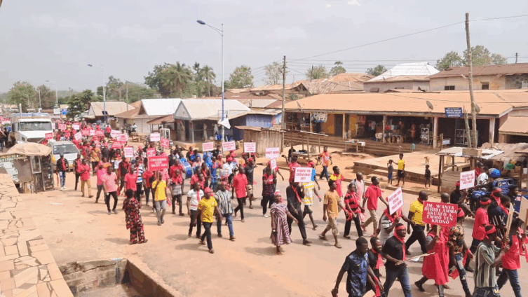 The farmers marched through the main streets of Sefwi Wiawso, Juaboso and Bia West on Thursday, carrying placards that read “Restore Our Price Now” and “Cocoa Sustains Ghana, Don’t Neglect Farmers.”
