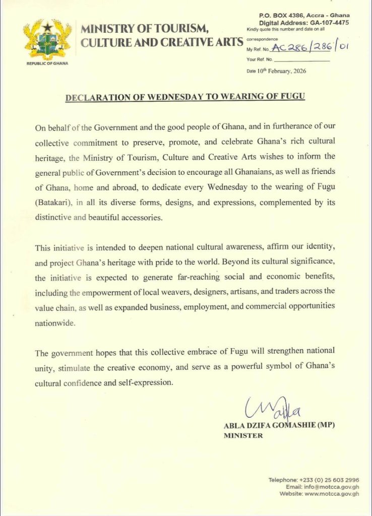 In a statement dated February 10, 2026, and signed by the Minister for Tourism, Culture and Creative Arts, Abla Dzifa Gomashie, the ministry said the initiative is aimed at encouraging Ghanaians, as well as friends of Ghana at home and abroad, to dedicate every Wednesday to wearing the traditional attire in its various forms and designs.