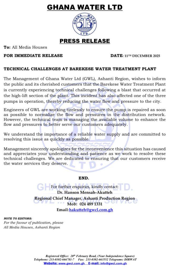 Ghana Water Limited (GWL) in the Ashanti Region has confirmed technical difficulties at the Barekese Water Treatment Plant following a blast in the plant’s high-lift section.