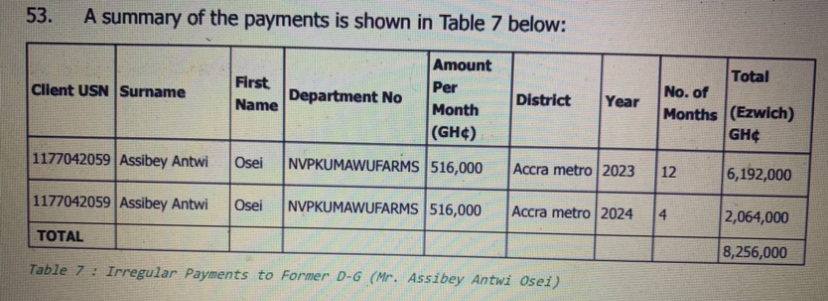 The report, which examined payroll and financial transactions related to the National Service Programme (NSP), uncovered a pattern of unusually high payments to Mr. Assibey Antwi under suspicious circumstances.