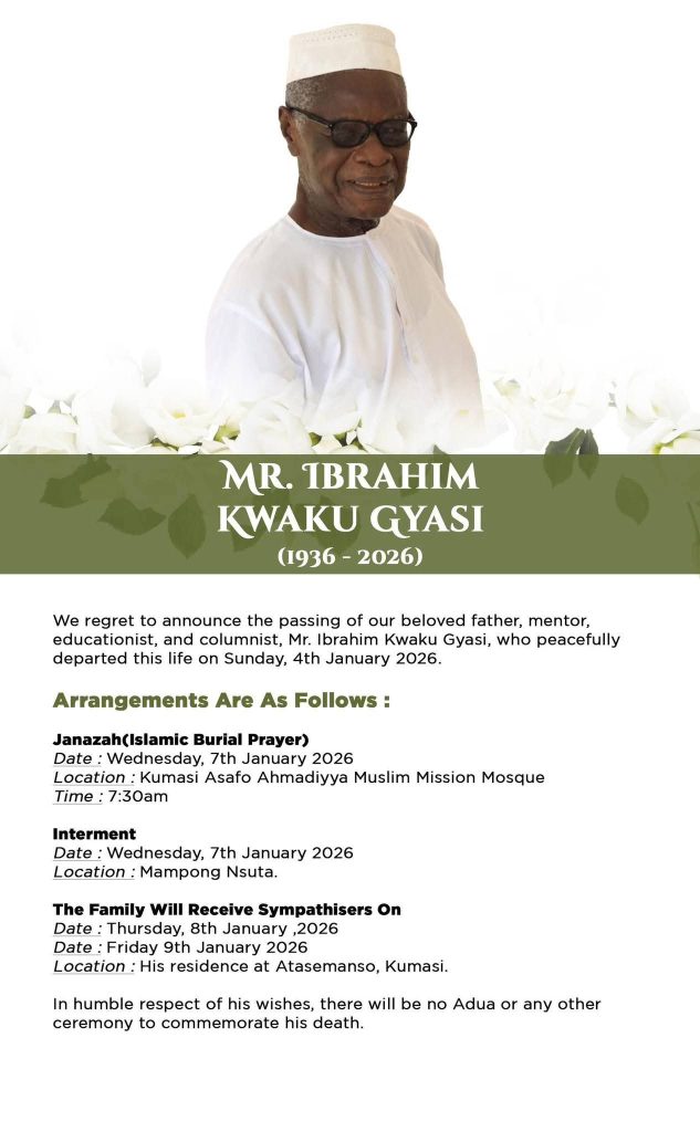 According to the family, the Janazah (Islamic burial prayer) will be held on Wednesday, January 7, 2026, at 7:30 a.m. at the Kumasi Asafo Ahmadiyya Muslim Mission Mosque. Burial will take place the same day at Mampong Nsuta.