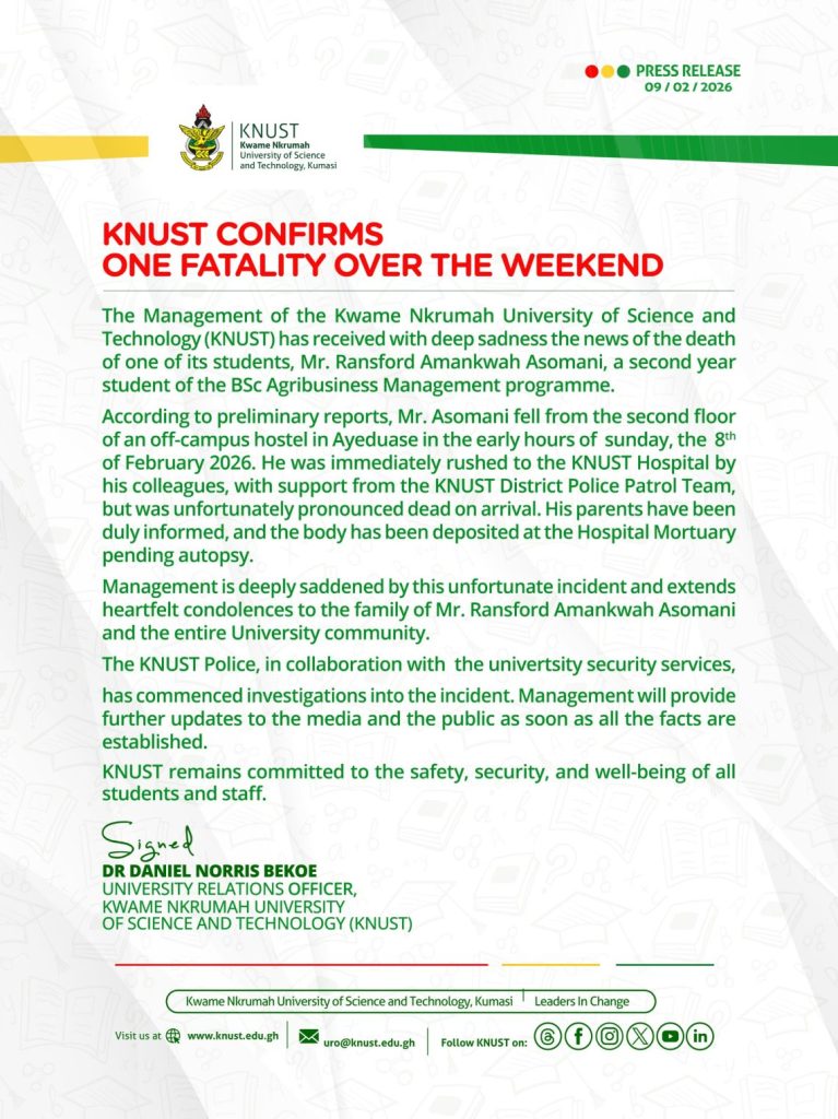 According to preliminary reports, Mr. Asomani fell from the second floor of an off-campus hostel at Ayeduase in the early hours of Sunday, February 8, 2026. He was rushed to the KNUST Hospital by his colleagues, with assistance from the KNUST District Police Patrol Team, but was pronounced dead on arrival.