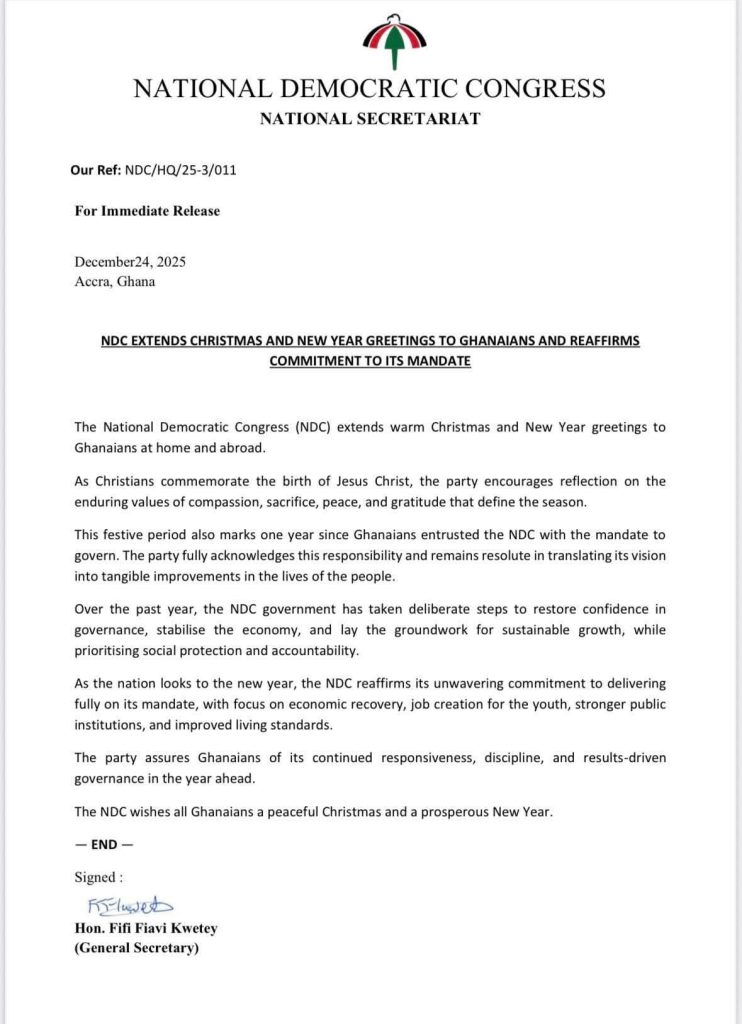 The statement, signed by the NDC’s General Secretary, Hon. Fifi Fiavi Kwetey, concluded with wishes for a peaceful Christmas and a prosperous New Year for all Ghanaians.