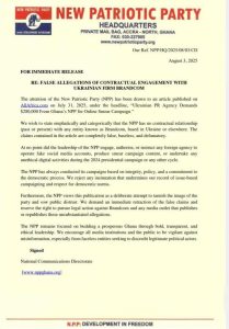 In a press statement issued on Sunday, the party dismissed a recent report by AllAfrica.com, which claimed that Brandcom was demanding $280,000 from the NPP for services related to an alleged disinformation campaign. The article, published on July 31, was titled: “Ukrainian PR Agency Demands $280,000 From Ghana’s NPP for Online Smear Campaign.”