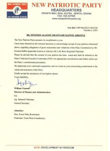 In a letter dated October 2, 2025, and signed by the party’s Director of Finance and Administration, William Yamoah, the NPP assured that the petition had been duly acknowledged and would be referred to the National Executive Committee (NEC) for consideration and further action in line with constitutional procedures.