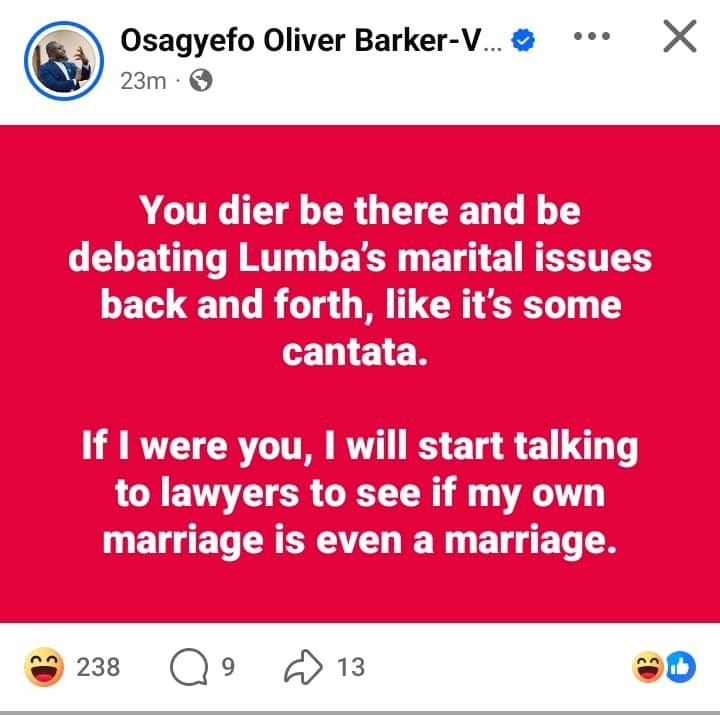 “You dier be there and be debating Lumba’s marital issues back and forth, like it’s some cantata,” he wrote. “If I were you, I will start talking to lawyers to see if my own marriage is even a marriage.”