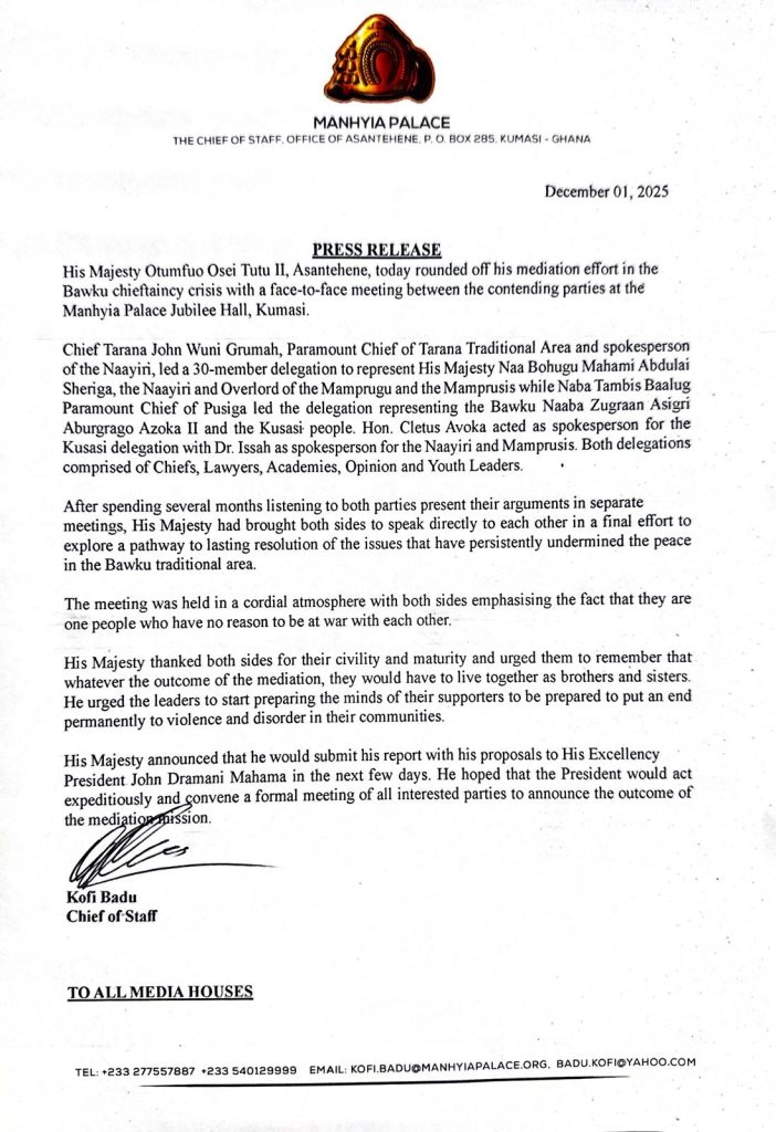 The statement was signed by Kofi Badu, Chief of Staff at the Manhyia Palace.