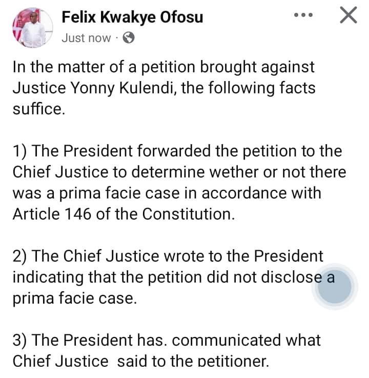 The Minister for Information, Felix Kwakye Ofosu, has clarified that a petition filed against Supreme Court Justice Yonny Kulendi did not establish a prima facie case, following constitutional review processes.