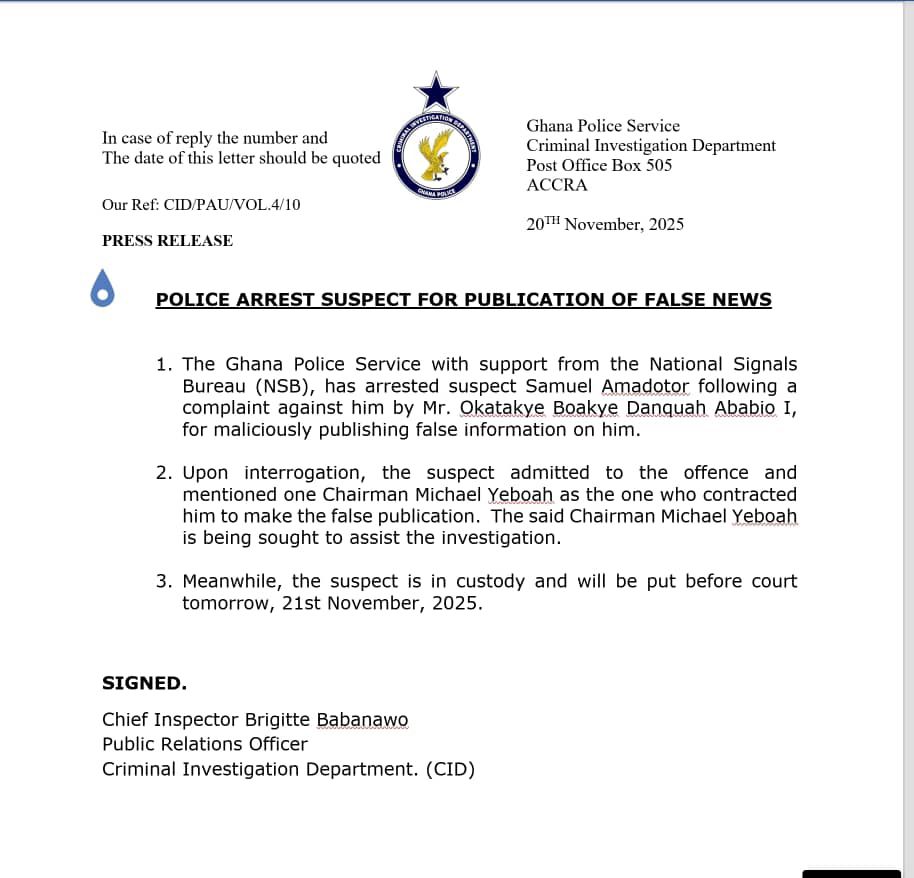 The Ghana Police Service has arrested a man identified as Samuel Amadotor for allegedly publishing false information about Okatakye Boakye Danquah Abaabio I.