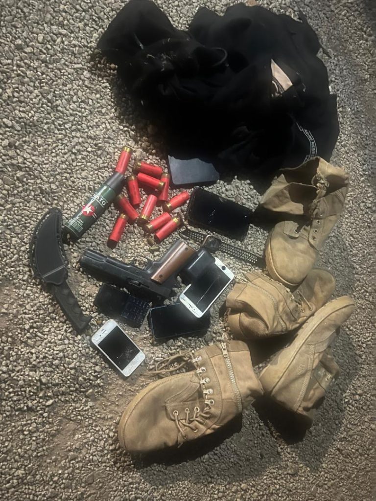 Items retrieved from the suspects include a pistol loaded with two rounds of .32 ammunition, eleven BB cartridges, a locally manufactured weapon (“blantine”), pepper spray, desert boots, multiple mobile phones, and a black pullover.