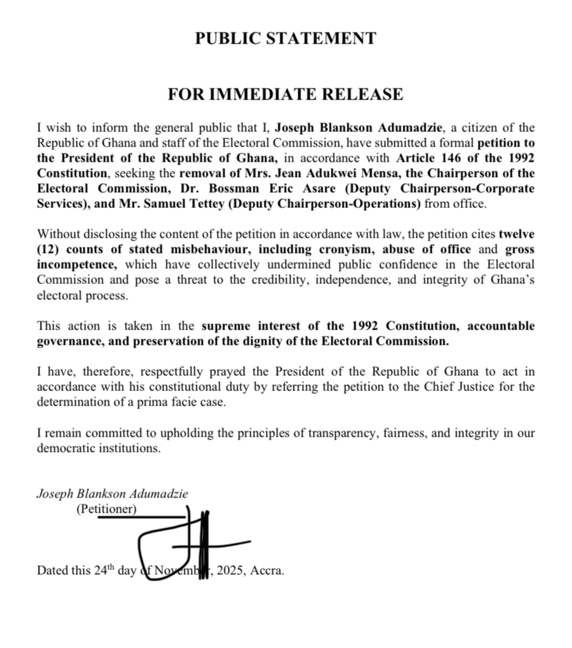 Joseph Blankson Adumadzie, an Electoral Commission staff member, has formally petitioned President John Dramani Mahama to remove Mrs. Jean Adukwei Mensa, Chairperson of the Electoral Commission, along with her two deputies, Dr. Bossman Eric Asare and Mr. Samuel Tettey.