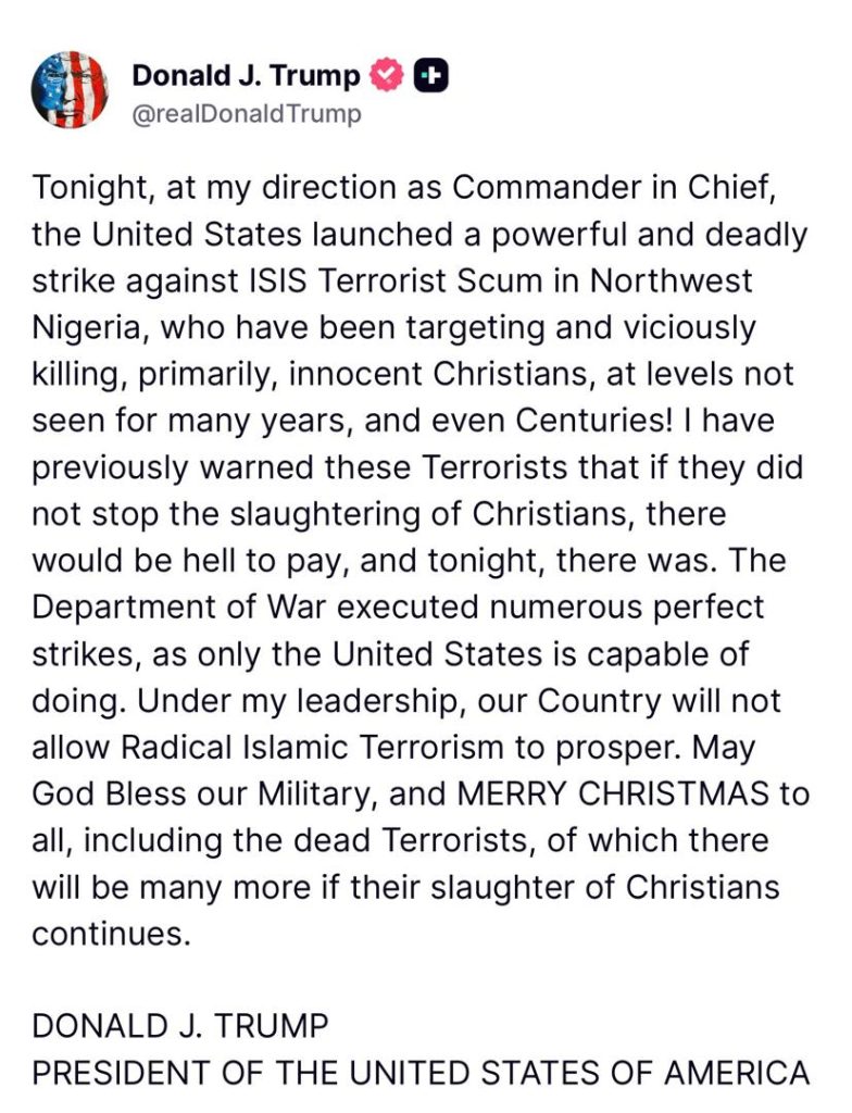In a statement released on Thursday night, on X Trump said the strike was conducted at his direction and targeted what he described as ISIS fighters responsible for the killing of innocent civilians, particularly Christians.