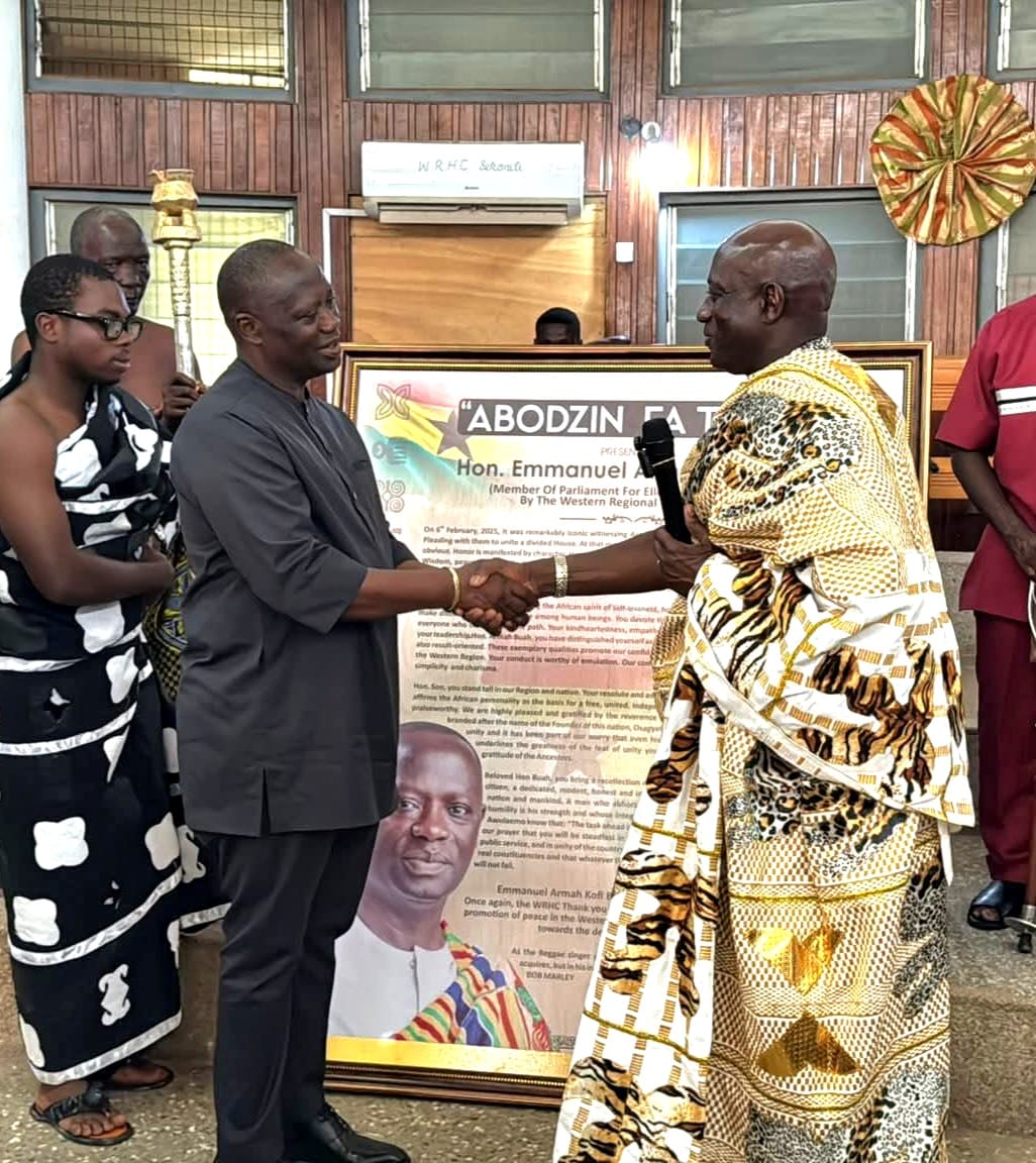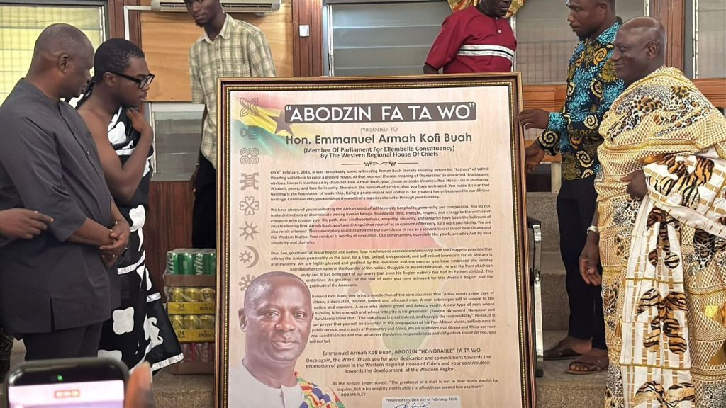 The Western Regional House of Chiefs has conferred honours on the Member of Parliament for Ellembelle and Minister for Lands and Natural Resources, Emmanuel Armah-Kofi Buah, in recognition of his instrumental role in restoring peace and unity to the institution following a protracted five-year leadership dispute.
